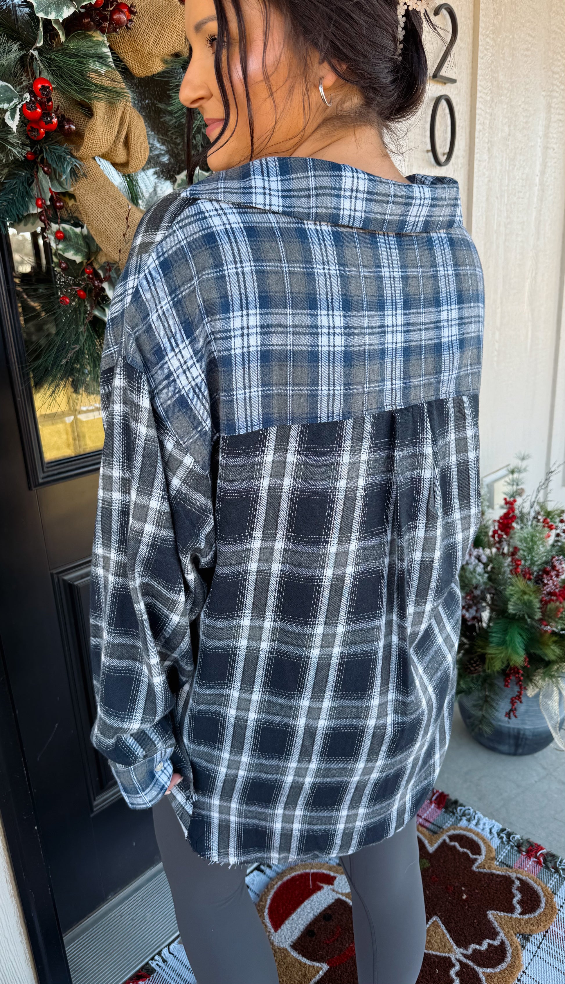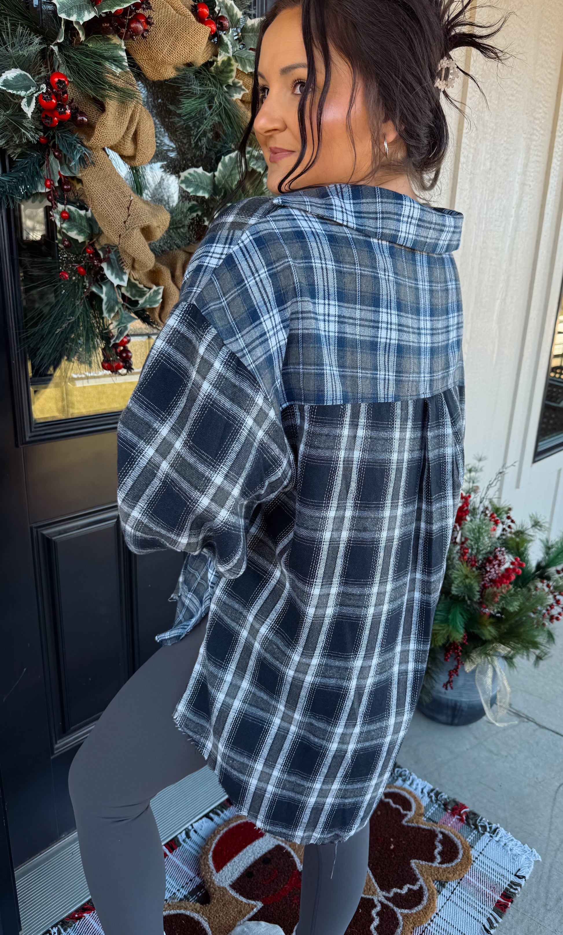 This oversized flannel gives all the cozy, throw-on-and-go vibes. Featuring a mix of blue, grey, and black plaids, a relaxed fit, and a raw hem, it’s the perfect blend of casual and cute. Lightweight, soft, and long enough for leggings—your new everyday layer for chilly days and cozy weekends.